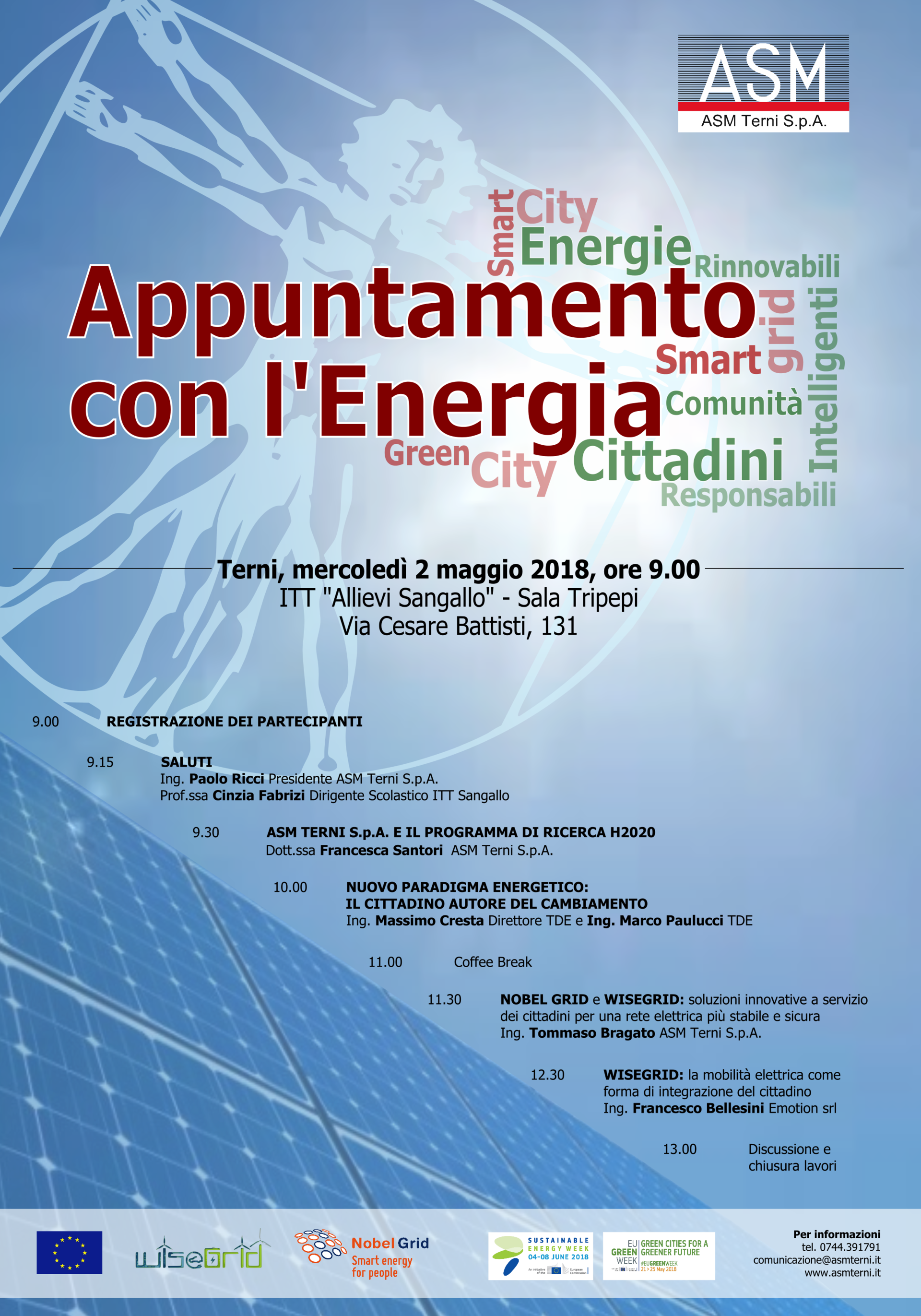 18 Aprile, Terni.-mercoledì 2 maggio, la società municipale ASM Terni Spa organizzerà e ospiterà l'evento denominato "Appuntamento con l’Energia" situato presso l'Istituto tecnologico "Allievi-Sangallo ". Questo incontro altamente interattivo mira a sensibilizzare i cittadini riguardo alla transizione energetica sostenibile e a mostrare soluzioni energetiche intelligenti e pulite sviluppate da due dei progetti Horizon 2020 a cui l'organizzazione sta lavorando: NOBEL GRID e WiseGRID.